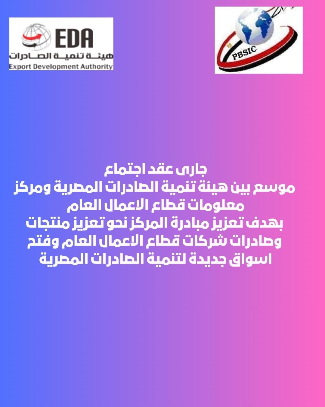 وبالتنسيق والتعاون بين هيئة تنمية الصادرات ومركز معلومات قطاع الاعمال العام سيتم عقد اجتماع موسع بين فريق العمل فى كلا الجهتين لبحث اطر التعاون المختلفة لانجاح مبادرة المركز نحو تعزيز منتجات وصادرات شركات قطاع الاعمال العام وفتح اسواق جديدة امام الصادرات المصرية