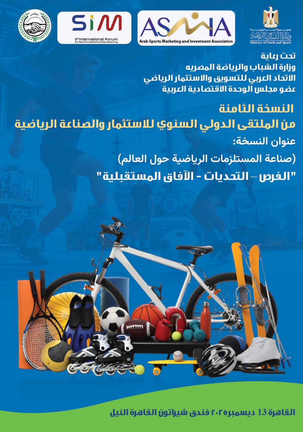هيئة تنمية الصادرات تدعوكم فى المشاركة فى النسخة الثامنة من الملتقى الدولي للاستثمار والصناعة الرياضية، الذي تنظمه وزارة الشباب والرياضة برعاية دولة رئيس مجلس الوزراء الدكتور مصطفى مدبولي، وبالتعاون مع الاتحاد العربي للتسويق والاستثمار الرياضي (ASMIA)، بمشاركة واسعة من شخصيات بارزة ومؤسسات رياضية واقتصادية من داخل مصر وخارجها وذلك يوم 13 ديسمبر 2025 بمقر فندق شيراتون القاهرة.