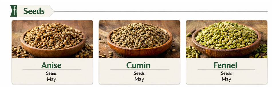 البذور اليانسون (Anise) – بذور | الموسم: مايو الكمون (Cumin) – بذور | الموسم: مايو الشمر (Fennel) – بذور | الموسم: مايو