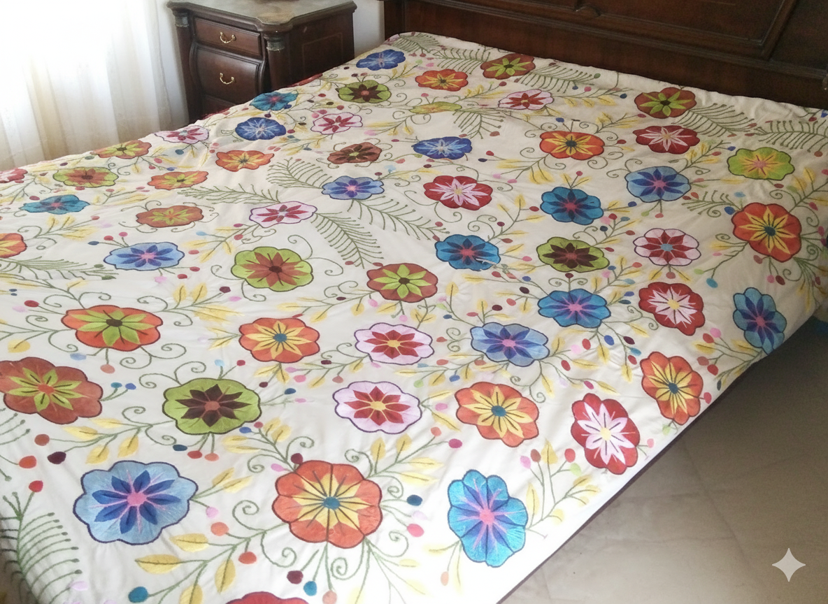 مفرش سرير مطرز يدويًا ومبطن بمقاس 250×225 سم، يأتي مع خددتين مُنجّدتين ومبطنتين بمقاس 50×50 سم. يتميز بتصميم أنيق وتطريز دقيق يضفي لمسة فنية راقية على ديكور غرفة النوم. صُنِع في مصر بعناية من أجود أنواع الخامات، منها القطن المصري الفاخر، ليعكس تميّز الحرف اليدوية المصرية.