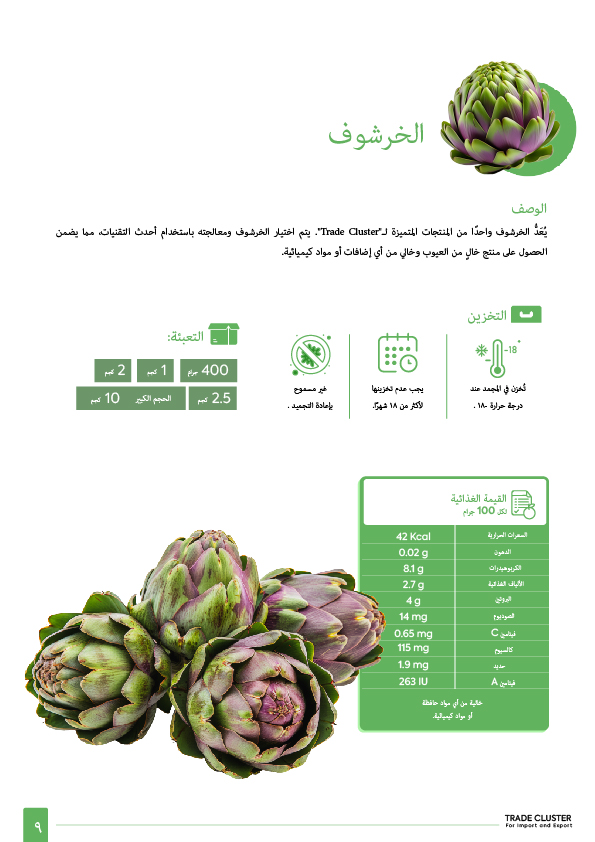 يتم اختيار الخرشوف ."Trade Cluster" يُعَدُّ الخرشوف واحدًا من المنتجات المتميزة ل ومعالجته باستخدام أحدث التقنيات، مما يضمن الحصول على منتج خالٍ من العيوب وخالي من أي إضافات أو مواد كيميائية.